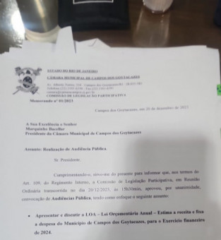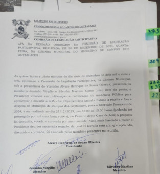 Segundo o líder do governo, Álvaro Oliveira (PSD), a Comissão de Legislação Participativa tem prerrogativa para solicitar a realização da audiência. “Eu, o vereador Juninho, o vereador Silvinho deliberamos e decidimos e passamos a informar a vossa excelência. Nos termos do artigo 109 do Regimento Interno, a Comissão (...) aprovou por unanimidade a convocação de audiência pública para apresentar e discutir a Lei Orçamentária anual que estima receita e fixa despesa do município de Campos para o exercício financeiro de 2024 (...) A referida audiência será realizada no dia 27/12, às 13h até as 15h, podendo ser prorrogada por mais hora e meia no plenário dessa Casa”, disse Álvaro, que apresentou o documento com 15 assinaturas da base.
