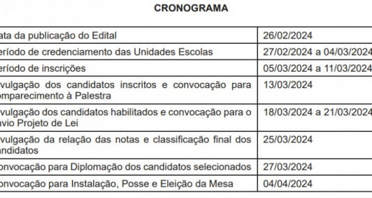 O credenciamento de unidades escolares para a seleção do primeiro Parlamento Jovem Campista, projeto da Câmara de Vereadores de Campos, começa nesta terça-feira (27). O objetivo é promover a cidadania e incentivar a participação dos estudantes no debate público. Ele será dividido por faixa etária, entre Parlamento Mirim (10 a 12 anos) e Parlamento Juvenil (13 a 18 anos). O Edital do processo de seleção foi publicado no Diário Oficial do Município nesta segunda-feira (26). Confira aqui o Edital nº 001/2024.