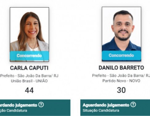 O município de São João da Barra teve seus dois candidatos à prefeitura registrados nesta quarta-feira (14), no DivulgaCand, sistema do Tribunal Superior Eleitoral (TSE). O nome da atual prefeita e candidata à reeleição, Carla Caputi (União), e de Danilo Barreto (Novo), foram formalizados junto à Justiça Eleitoral. Ambos os registros aguardam julgamento.